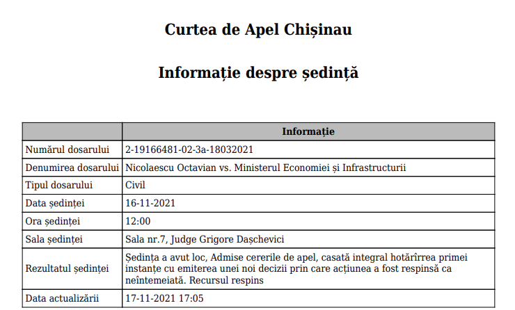 Объявление заместителя премьер-министра, министра инфраструктуры и регионального развития Андрея Спыну было сделано в контексте того, что Кишиневская апелляционная палата во вторник, 16 ноября, удовлетворила апелляции, поданные представителями Министерства экономики и инфраструктуры, и полностью отменила решение суда Кишинева от 21 января 2021 года, которым Николаеску, уволенный в 2019 году с должности директора УГА бывшим министром экономики правительства Санду, был немедленно восстановлен в этой должности.