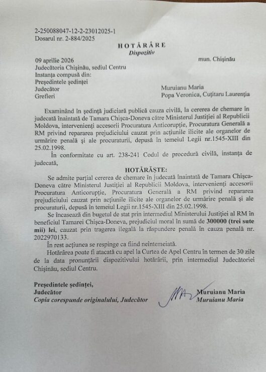 Судья Мария Муруяну из Кишиневского суда сектора Центр постановила присудить Тамаре Кишка-Доневой компенсацию в размере 300 тысяч леев в качестве морального ущерба. Решение было принято в рамках рассмотрения гражданского иска, поданного бывшей судьей против Министерства юстиции Республики Молдова, с участием в качестве третьих лиц Антикоррупционной прокуратуры и Генеральной прокуратуры.