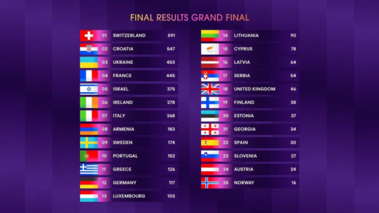 Согласно правилам конкурса, победитель определялся голосами жюри и зрителей в пропорции 50/50. Nemo получил в общей сложности 591 балл: 365 от жюри и 226 — от зрителей.