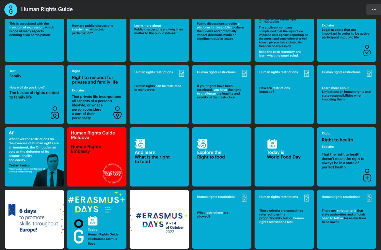 Гид по правам человека для Молдовы – это инициатива, которая продвигает культуру основных прав посредством доступных инструментов, визуальных ресурсов и примеров из национального контекста. Гид по правам человека для Молдовы был официально запущен на Европейской платформе для образования в области прав человека в ноябре 2023 года, и стал доступен для широкой общественности на онлайн платформе – humanrightsguide.md – на румынском, русском и английском языках.