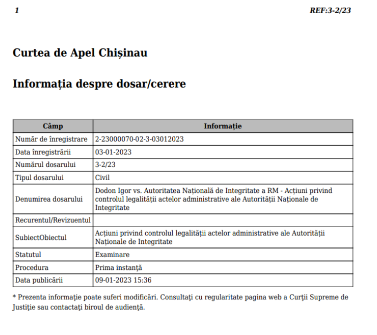 Согласно информации с сайта суда, дело было зарегистрировано в Апелляционной палате Кишинева 3 января 2023 года. Пресс-секретарь Апелляционной палаты Кишинева Ион Бокан сообщил для «Ziarul de Gardă», что слушания по этому делу еще не назначены.