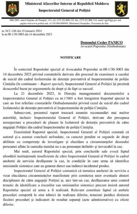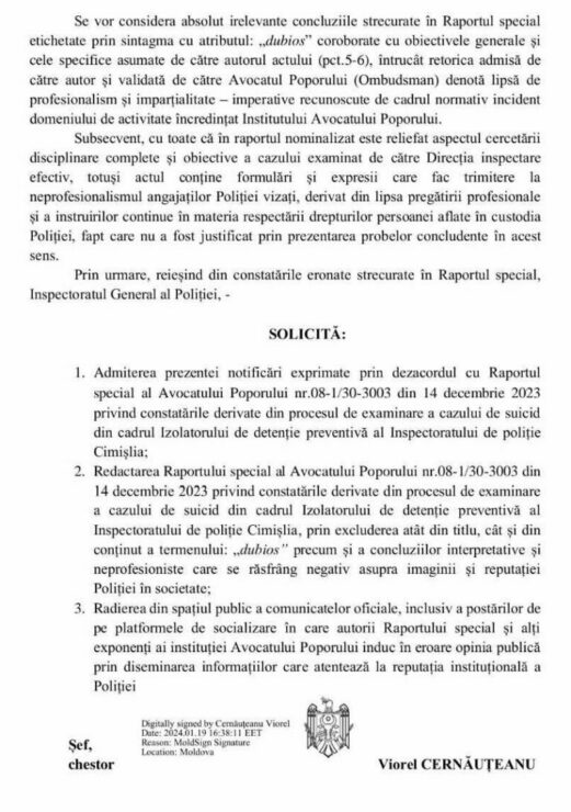 Согласно документам, имеющимся в распоряжении «ZdG», в пятницу, 19 января, глава ГИП Виорел Чернэуцяну направил народному адвокату официальное письмо, в котором выразил свое несогласие с «Отчетом о выводах, полученных в процессе рассмотрения дела о самоубийстве в изоляторе предварительного заключения инспектората полиции Чимишлии». В официальном письме глава ГИП попросил отредактировать отчет, «исключив как из названия, так и из содержания термин „сомнительный“», а также выводы, которые он квалифицировал как «интерпретирующие и непрофессиональные» и «которые негативно отразятся на имидже и репутации полиции в обществе».