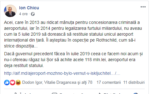 15 мая 2020 года бывший премьер-министр Ион Кику заявил в Facebook , что «те, кто в 2013 году поднял руку за преступную концессию аэропорта, а в 2014 году — за легализацию хищения миллиарда, не могли 5 июля 2019 года захотеть вернуть государству единственный в стране международный аэропорт. Они с опаской ждали Ротшильда, и как бы не испортить ему настроение. Если бы предыдущее правительство сделало в июле 2019 года то, что мы делаем сейчас, и не дало Шору время на выплату 118 млн леев, аэропорт уже был бы возвращен государству».