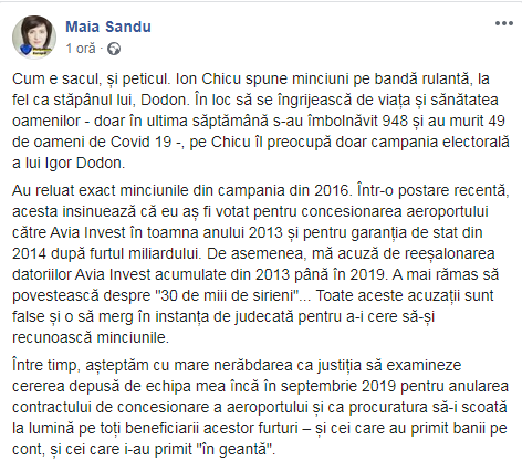 14 мая 2020 года после заседания Высшего совета безопасности бывший президент Игорь Додон выступил перед СМИ и обвинил правительство, возглавляемое в то время Майей Санду, в том, что в июне-июле 2019 года оно не воспользовалось возможностью вернуть Кишиневский аэропорт в государственное управление и реэшенировало долг компании Avia Invest в размере 118 млн леев.