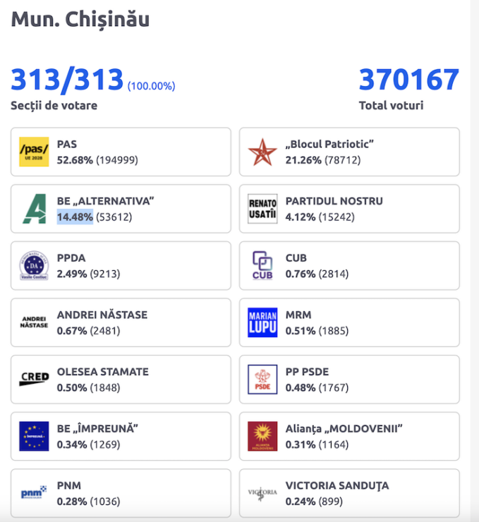 Более 370 160 жителей Кишинева приняли участие в голосовании на парламентских выборах в воскресенье, 28 сентября. Согласно окончательным результатам голосования по муниципию, 52,68% избирателей проголосовали за партию «Действие и солидарность» (PAS).