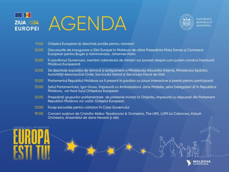 9 мая на площади Великого национального собрания будет отмечаться День Европы под лозунгом «LIBERTATE, PACE, PROSPERITATE — EUROPA EȘTI TU» («Свобода, мир, процветание, ЕВРОПА, — это ты»). Правительство опубликовало программу мероприятий по данному случаю. Кульминацией праздника станет концерт с участием Кристофора Алдя-Теодоровича и его оркестра, «The Urs», «Lupii lui Calancea», ансамбля «Hecenii» и группы «Kalush Orchestra» из Украины, победителей «Евровидения-2022», и других исполнителей.