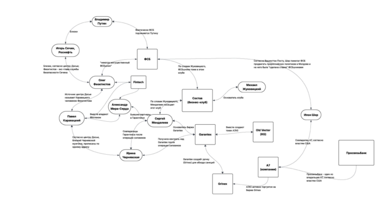 По данным «Досье», Феоктистов имеет отношение к криптобирже на 14-м этаже башни «Федерация» в Москва-Сити. ICIJ уточняет, что там находится биржа Fintech, которой владеют Каравацкий и Александр Мира Серда — бывший партнер Менделеева по Garantex. По данным ICIJ, юрлицо Fintech использует телефоны и почту государственной «Роснефти». Этой государственной компанией управляет старый друг Владимира Путина, олигарх Игорь Сечин. Они оба выходцы из КГБ.