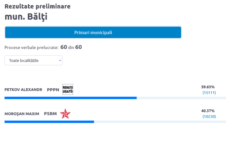 Кандидат от Нашей партии Александр Петков занял место примара в мун. Бэлць по итогам второго тура выборов. Он получил 59,63% голосов избирателей. Его соперник, Максим Морошае, представляющий ПСРМ, получил 40,37% голосов.