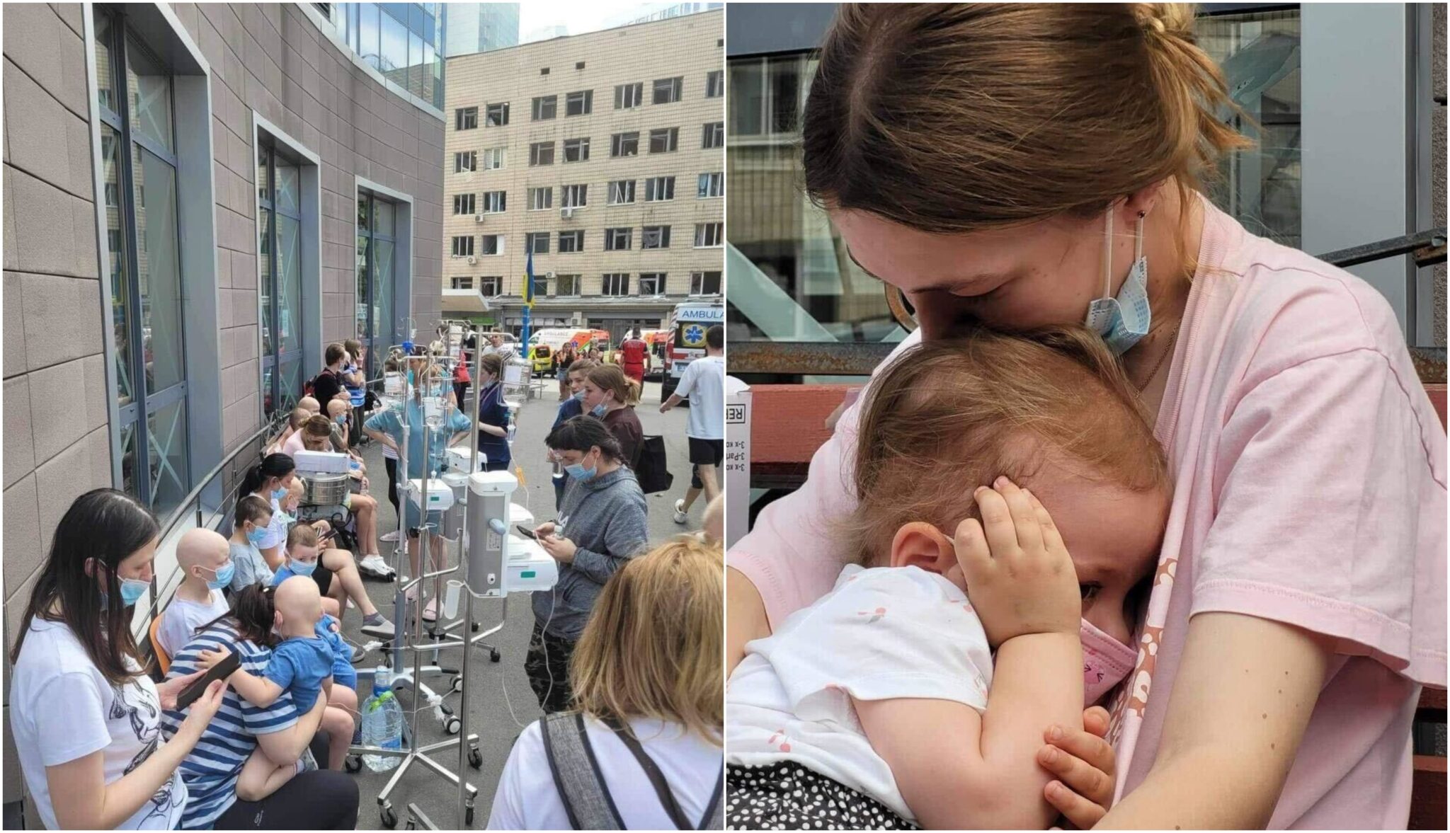 Children and their mothers who were treated at “Okhmatdit” sit next to the damaged building of the children’s hospital.