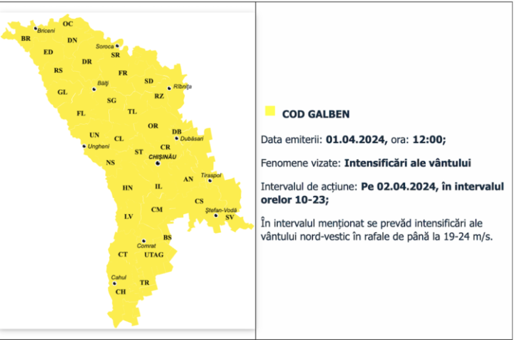 Желтый код: погодные условия потенциально опасны, ожидаемые метеорологические явления (ливни, грозы, порывы ветра, высокие или низкие температуры, возможные повышения дебитов и уровней воды и др.) обычны для территории страны, но временами могут представлять опасность для отдельных видов социально-экономической деятельности.