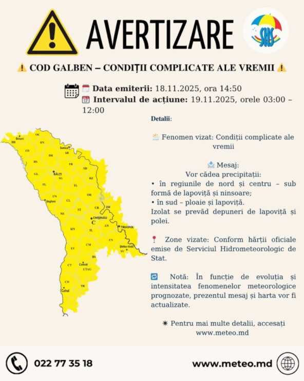 Государственная гидрометеорологическая служба Молдовы объявила на 19 ноября желтый код из-за сложных погодных условий: прогнозируются снег, мокрый снег и дождь.