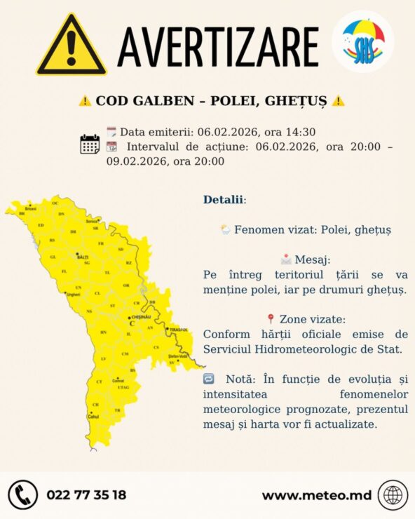 В ближайшие дни на всей территории Республики Молдова сохранится неблагоприятная погода. Государственная гидрометеорологическая служба в пятницу, 6 февраля, объявила новое метеопредупреждение — желтый код в связи с гололедом и наледью.