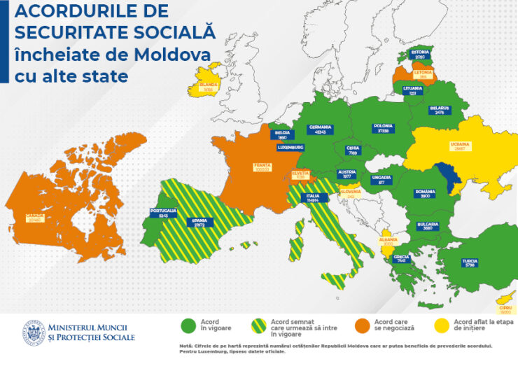 Республика Молдова обеспечивает защиту и гарантии прав на социальное страхование работников нашей страны, осуществляющих или осуществлявших трудовую деятельность на территории другого государства, посредством 17 двусторонних соглашений в области социального обеспечения, заключенных с другими странами. В настоящее время действуют 16 соглашений, на основании которых установлены 1916 социальных выплат, получателями которых являются граждане Молдовы, говорится в пресс-релизе, опубликованном Министерством труда и социальной защиты.