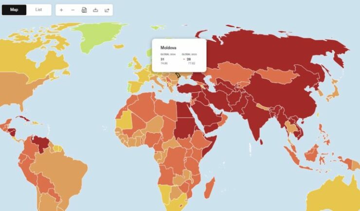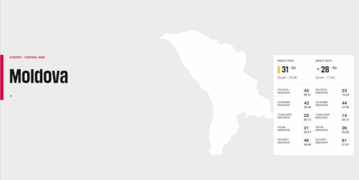 Молдова занимает 31-е место из 180 в рейтинге Всемирного индекса свободы прессы, поднявшись на 3 позиции по сравнению с 2023 годом. Таким образом, наша страна набрала 74,86 из максимальных 100 баллов по сравнению с 77,62 в предыдущем году. В 2022 году Молдова была на 40-й позиции среди 180 стран.