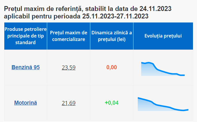 «Если два месяца назад 95-й бензин можно было продавать по цене 26,89 леев за литр, а стандартное дизельное топливо — по 24,81 лея за литр, то в ближайшие 3 дня (25.11-27.11.2023) отпускная цена на эти два вида топлива, установленная НАРЭ, не будет превышать уровня: