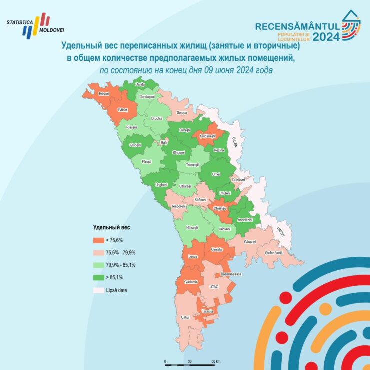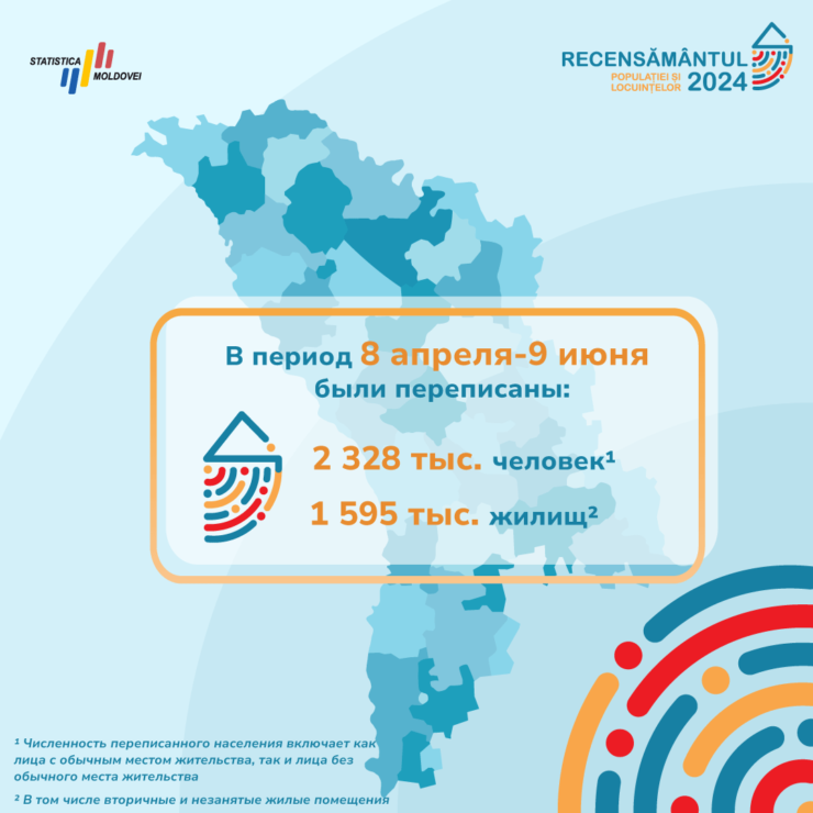 Национальное бюро статистики сообщает что, по состоянию на 9 июня в рамках переписи населения и жилищ было переписано около 1595 тысяч жилищ (включая занятые, вторичные и незанятые жилые помещения) и около 2 млн 328 тысяч человек (в число переписанного населения входят как лица с обычным местом жительства, так и лица без обычного места жительства в Республике Молдова, включая возможные дублирования, которые будут выявлены на этапе обработки).