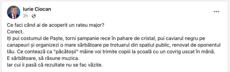 Надеваешь пасхальный костюм, разливаешь охлажденное шампанское в хрустальные бокалы, раскладываешь черную икру по канапе и устраиваешь большую вечеринку на тротуаре в общественном пространстве, отремонтированном твоим оппонентом. Какая разница, что “грешники” завтра отправят детей в школу с сухим бубликом в руках.