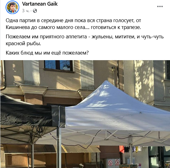 «Одна партия в середине дня пока вся страна голосует, от Кишинева до самого малого села…. готовиться к трапезе. Пожелаем им приятного аппетита – жульены, мититеи, и чуть-чуть красной рыбы.Каких блюд мы им ещё пожелаем?» – написал Вартанян в социальных сетях.