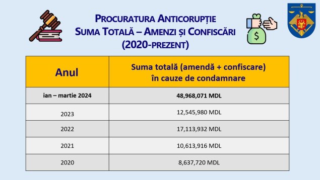 Антикоррупционная прокуратура сообщила, что за первые три месяца текущего года судьи назначили штрафы и одобрили конфискацию на общую сумму в 49 миллионов леев по уголовным делам, направленным в суд прокурорами ведомства. Глава Антикоррупционной прокуратуры Вероника Драгалин в своем комментарии в социальных сетях отметила: «Мы добьемся еще более впечатляющих результатов».