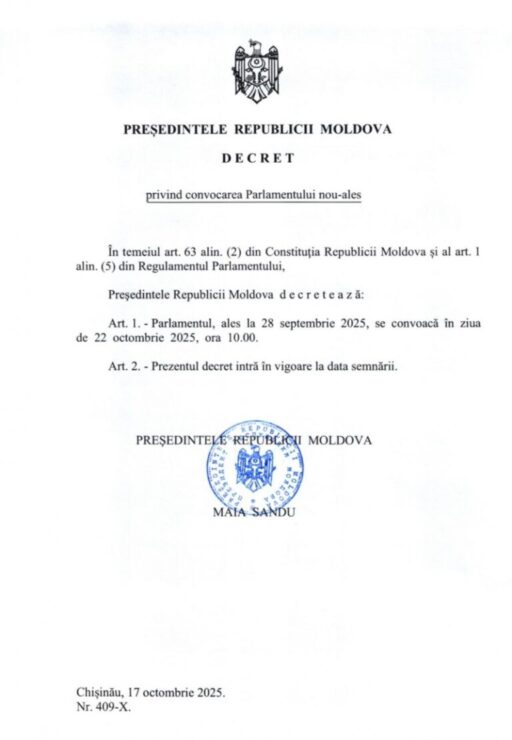 Президент Молдовы Майя Санду подписала в пятницу, 17 октября, указ о созыве парламента Республики Молдова XII созыва, сообщила администрация президента.