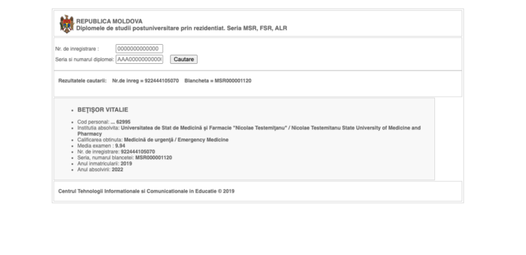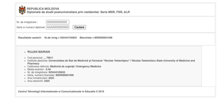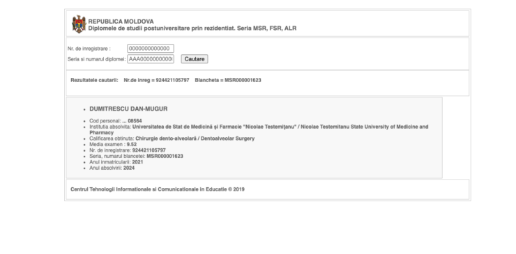 На портале, где можно проверить подлинность дипломов об образовании в Республике Молдова, указаны название учебного заведения, полученная квалификация, средний балл на экзамене, год поступления и год окончания.