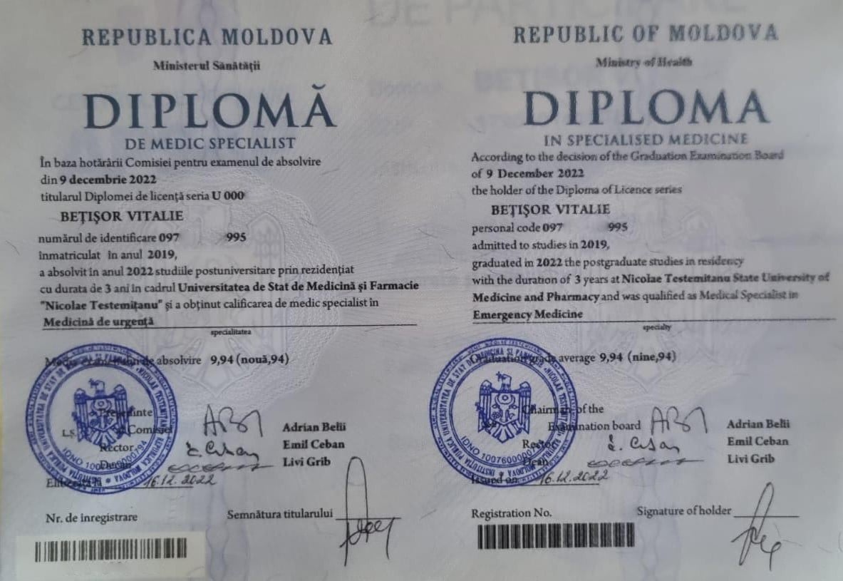 Один из дипломов выдан на имя Виталия Бецишора, который получил средний балл 9,94 и квалификацию специалиста по неотложной медицине.