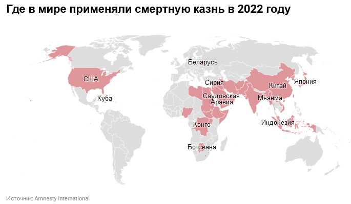 К 2022 году 112 стран в мире полностью упразднили смертную казнь, в 55 странах она применялась, а еще в 32, включая Россию, было «промежуточное положение»: там казнь не полностью отменена, но находилась под мораторием. Это следует из подсчетов международной правозащитной организации Amnesty International.