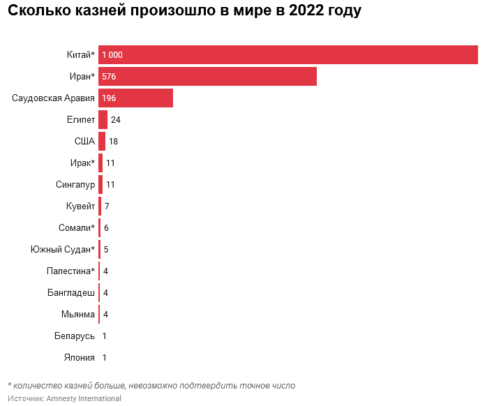 По подсчетам правозащитников, чаще всего в 2022 году людей казнят в Китае (точное количество казней неизвестно) и Иране (576 смертных приговоров). Это подтверждают и исследователи: