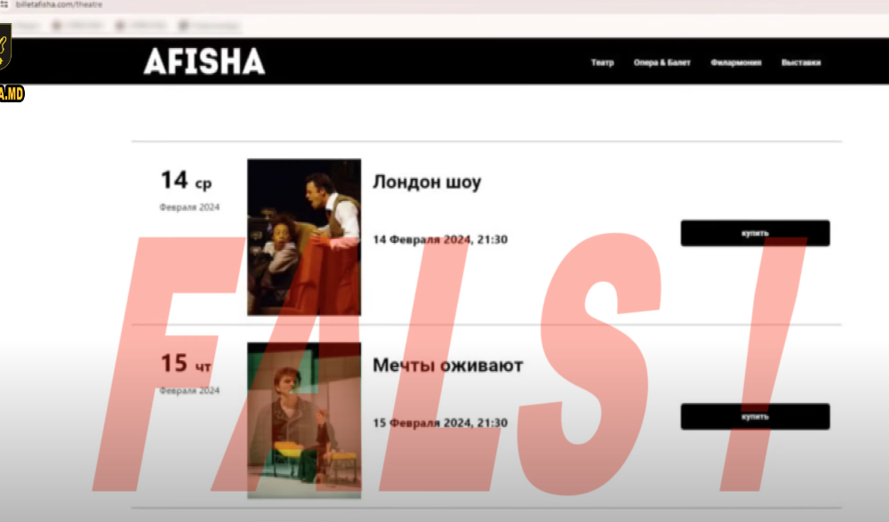 Правоохранительные органы опубликовали адреса нескольких таких поддельных сайтов: https://afishastichet.com.md/; https://biletafishas.com.md/; https:/ebiletafisha.md/.