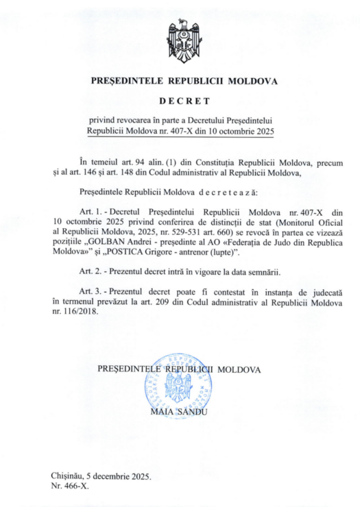 Решение о награждении государственными наградами двух лиц: Андрея Голбана, президента Общественного объединения «Федерация дзюдо Республики Молдова», и Григория Постикэ, тренера по борьбе, отменено. Президент Республики Молдова подписала соответствующий указ в пятницу, 5 декабря.