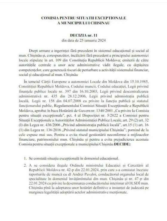 Комиссия по чрезвычайным ситуациям муниципия Кишинев своим решением от 25 января объявила чрезвычайную ситуацию в сфере образования и квалифицировала как «незаконный» приказ министра образования и исследований, которым был уволен начальник Главного управления образования, молодежи и спорта муниципия Кишинев Андрей Павалой. Между тем, фракция PAS в Муниципальном совете Кишинева заявила, что обратится в Государственную канцелярию в связи с принятым комиссией решением.
