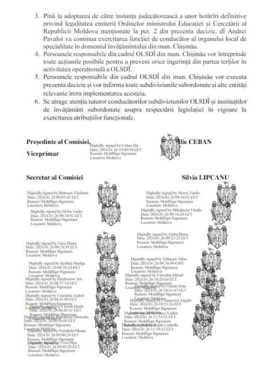«(…) Прямое вмешательство представителей PAS в дела примарии и нарушение закона путем увольнения с грубыми нарушениями и по собственной прихоти сотрудников из различных сфер. Комиссия по ЧС Кишинева констатировала чрезвычайную ситуацию в сфере образования и незаконность приказов министра образования по делу руководителя Управления образования, молодежи и спорта Андрея Павалоя до принятия судом окончательных решений о законности принятия указанных административных актов.