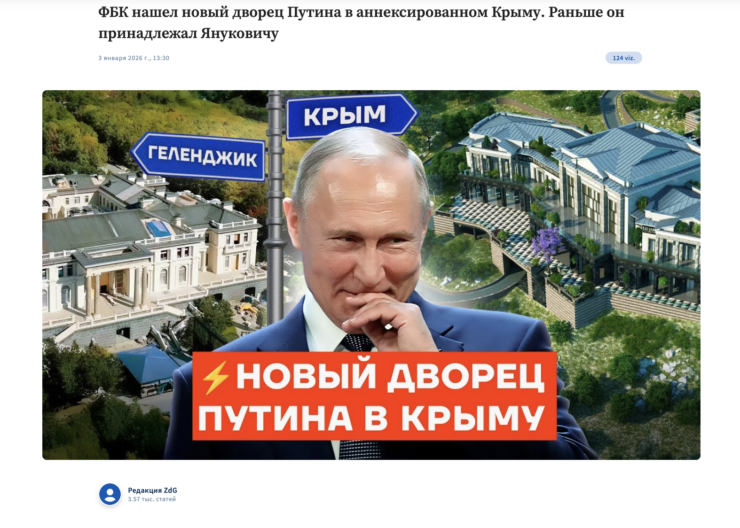 Речи идет о материале «ФБК нашел новый дворец Путина в аннексированном Крыму. Раньше он принадлежал Януковичу», который ZdG заимствовала у наших российских коллег.