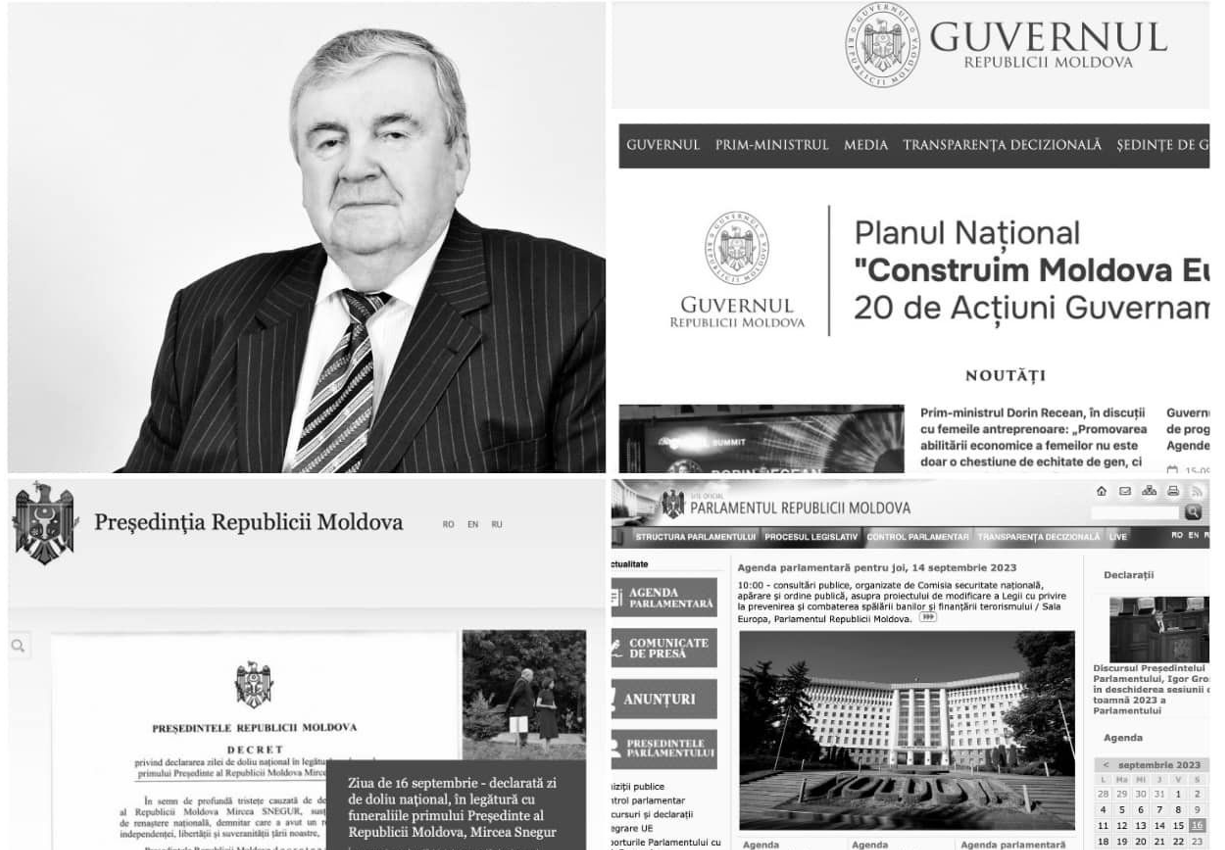 Сегодня сайты правительства, администрации президента, парламента и других государственных учреждений облачены в траур в знак глубокого уважения президента Мирчи Снегура.