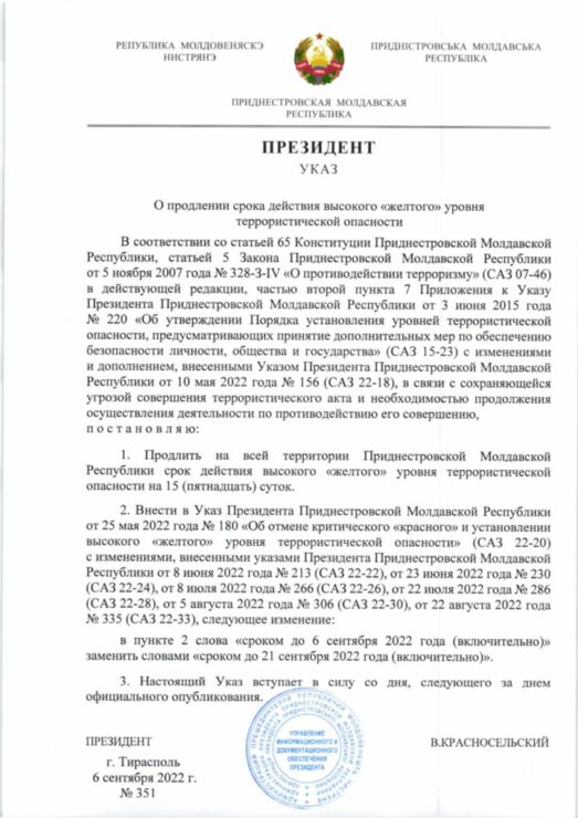 В приднестровском регионе продлено до 21 сентября действие «желтого» уровня террористической опасности. Соответствующий указ подписал во вторник, 6 сентября, так называемый тираспольский лидер Вадим Красносельский.