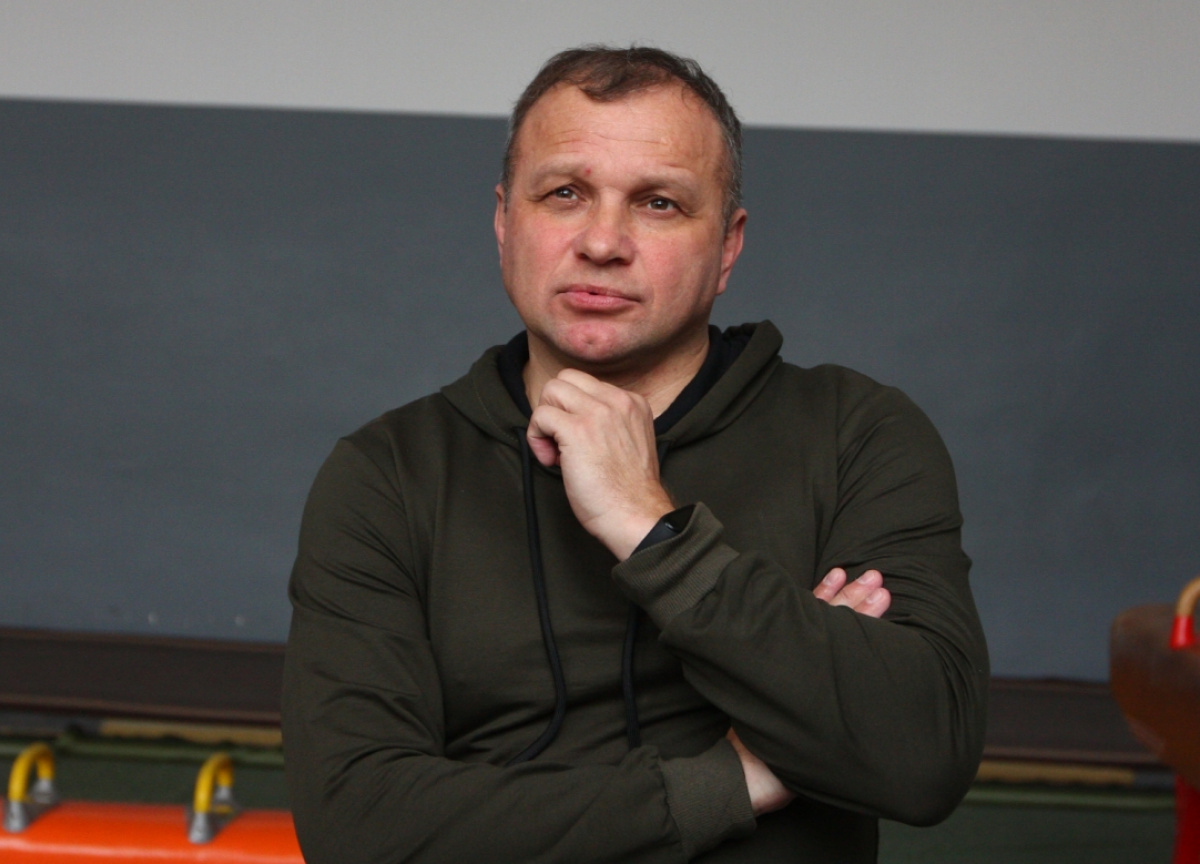 Заходим в зал со снаряжением. Пока что пусто, воспитанники придут позже. Невысокий крепкий мужчина в худи с гербом Украины опирается на спортивную колоду для гимнастов. Улыбкой, которую принято называть очаровательной, он похож на первого в мире космонавта Юрия Гагарина. Да и имя у него такое же.