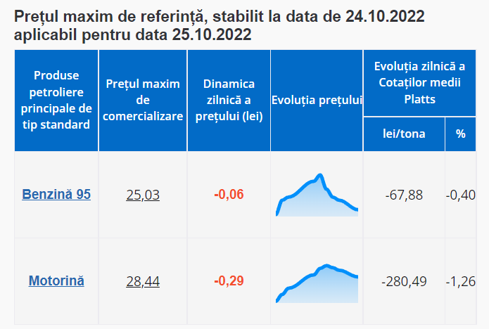 Национальное агентство по регулированию в энергетике (НАРЭ) опубликовало новые максимальные цены на топливо в Молдове на 25 октября. Цены на топливо снижаются.