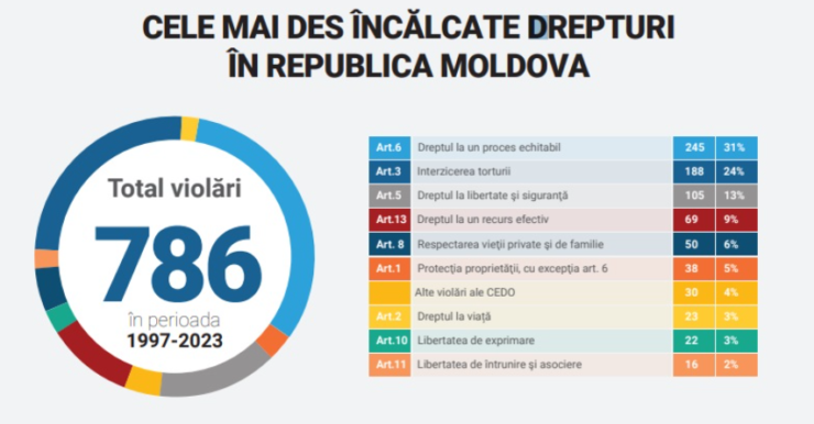За 26 лет, прошедших с тех пор, как Европейский суд по правам человека (ЕСПЧ) рассматривает жалобы, поданные против Республики Молдова, наша страна была осуждена ЕСПЧ за допущение 786 нарушений прав человека. По данным Центра правовых ресурсов Молдовы (CRJM), большая часть решений суда касается нарушения права на справедливое судебное разбирательство.
