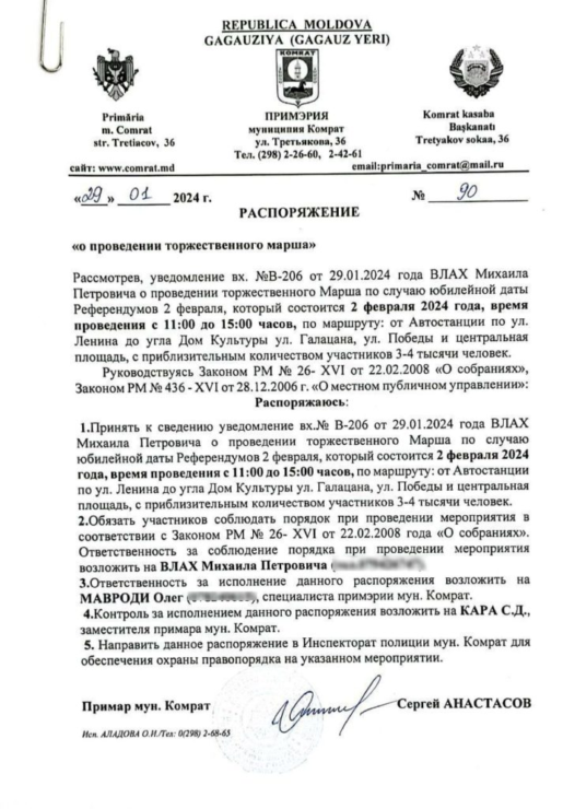 Так, в приказе указано, что учебные заведения Гагаузии должны обеспечить присутствие на марше 500 сотрудников и 80 учащихся 12-х классов.