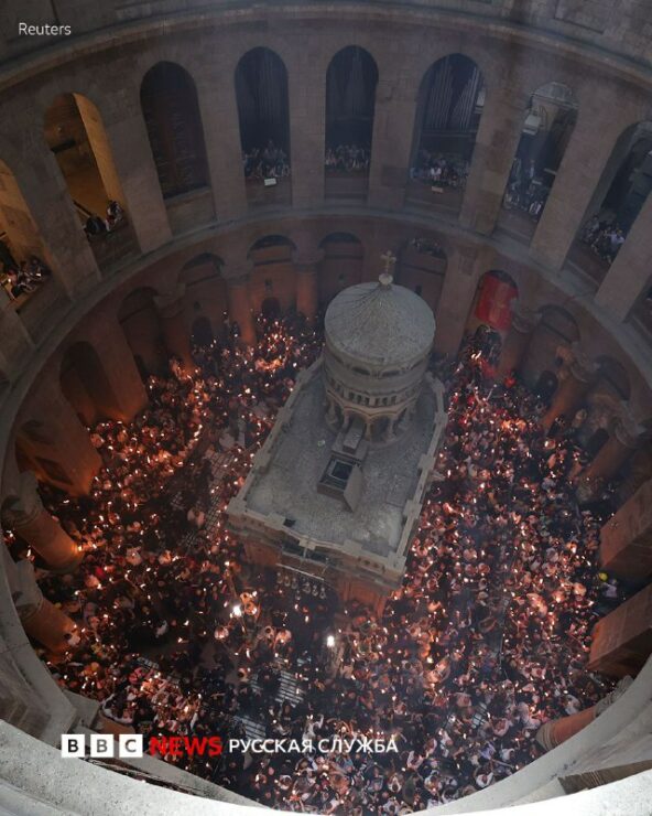 В храме Гроба Господня в Иерусалиме состоялась церемония схождения Благодатного огня. На церемонии присутствовали тысячи израильских христиан и паломников, прямую трансляцию из храма также вели телеканалы из разных стран, пишет BBC.