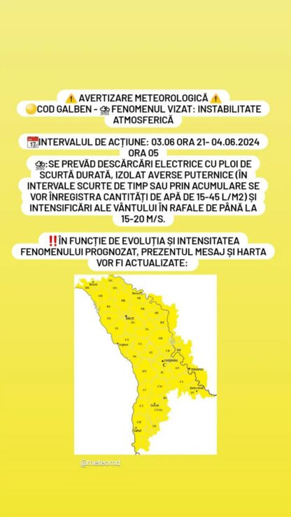 Государственная гидрометеорологическая служба Молдовы объявила желтый код в связи с нестабильной погодой. Метеорологическое предупреждение будет действовать с 21:00 3 июня до 5:00 4 июня.