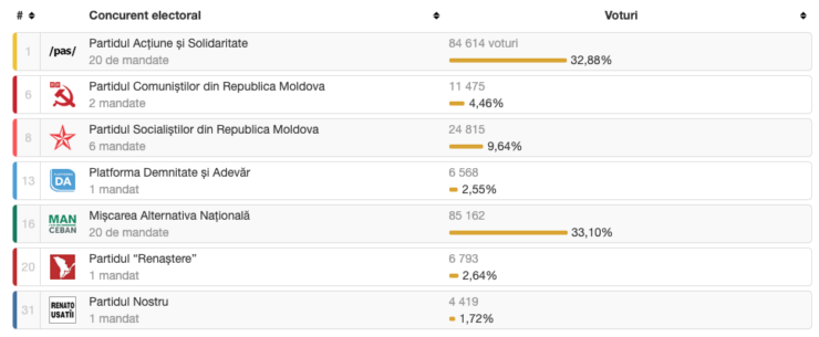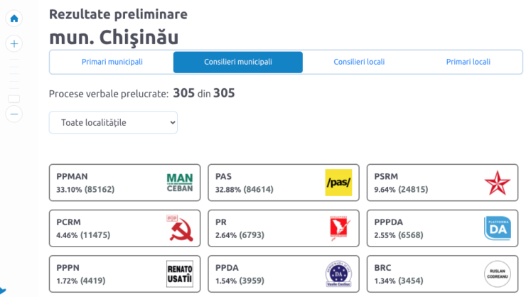 По данным сайта alegeri.md, Муниципальный совет Кишинева, избранный после выборов 5 ноября, будет представлен 7 политическими партиями: MAN — 20 советников, PAS — 20 советников, ПСРМ — 6 советников, ПКРМ — 2 советника, Платформа DA, партия «Возрождение» и «Наша партия» — по 1 советнику.