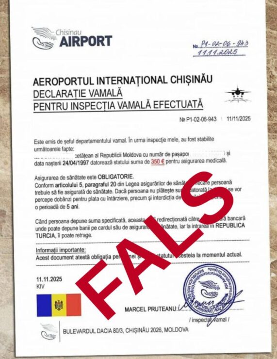 В интернете циркулирует так называемая «Таможенная декларация о прохождении таможенного досмотра», в которой указывается плата якобы за медицинскую страховку в размере 350 евро. Таможенная служба Республики Молдова предупреждает граждан о том, что данный «документ» является подделкой. Об этом ведомство сообщило на своей странице в Facebook 13 ноября.