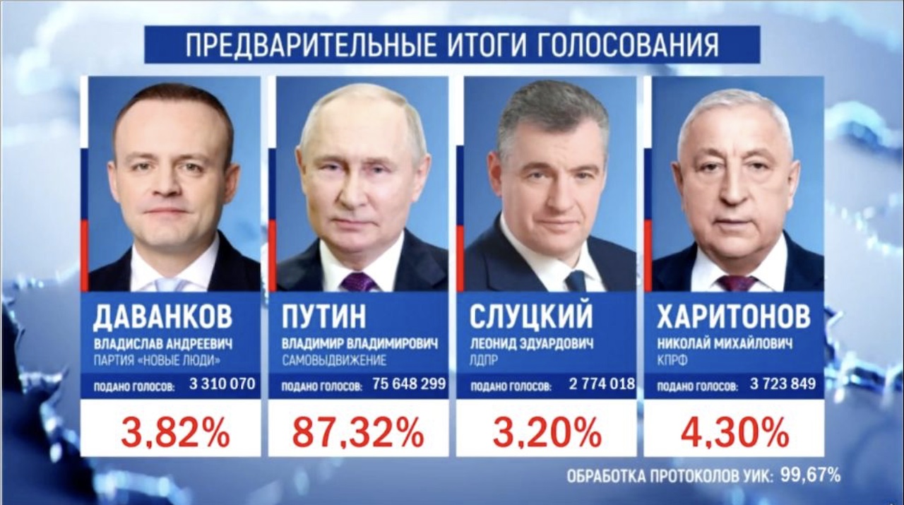 Владимир Путин побеждает на президентских выборах, прошедших 15-17 марта, как и ожидали российские и международные политики. Предварительные результаты, полученные после обработки 99,67% бюллетеней, показывают, что за него проголосовали более 87% всех избирателей.