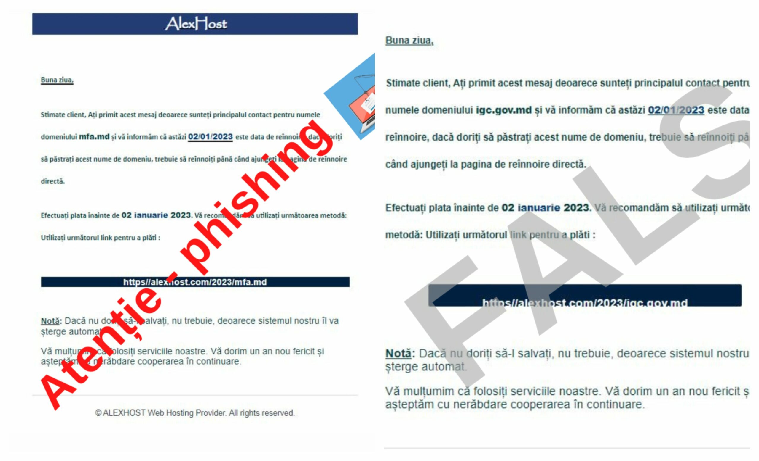 По данным STISC, владельцы доменов «.md» получают по электронной почте сообщения о якобы истечении срока действия доменного имени, их просят начать процедуру его продления, для чего надо пройти по ссылке и осуществить платеж.