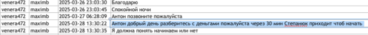 «Антон, добрый день. Пожалуйста, проясни ситуацию с деньгами! Через 30 минут придет Степанюк, чтобы мы начали. Мне нужно понимать, начинаем мы или нет», – обратилась Фуртунэ к своему куратору.