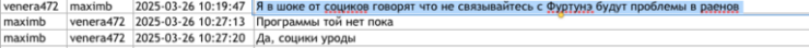 «Я в шоке от социков, они говорят, что если свяжутся с Фуртунэ, то у них будут проблемы в районах», – сообщила она Антону Трегубу.