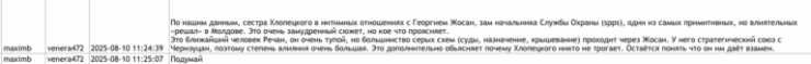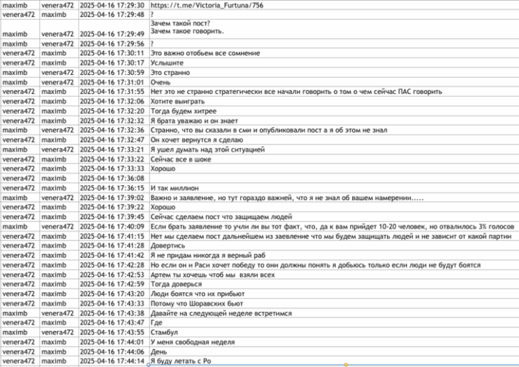 Другой опубликованный документ под названием venera472 Victoria Furtună-1 содержит страницу, на которой представлена переписка (март-август 2025 года), приписываемая Виктории Фуртунэ и Антону Трегубу, который использует псевдоним maximb. По данным Deschide.md, Трегуб был одним из российских кураторов Марины Таубер во время выборов мэра Бельц в 2021 году, а в 2024 году также оказывал логистическую и стратегическую поддержку предвыборной кампании Партии «Возрождение», связанной с осужденным Иланом Шором.