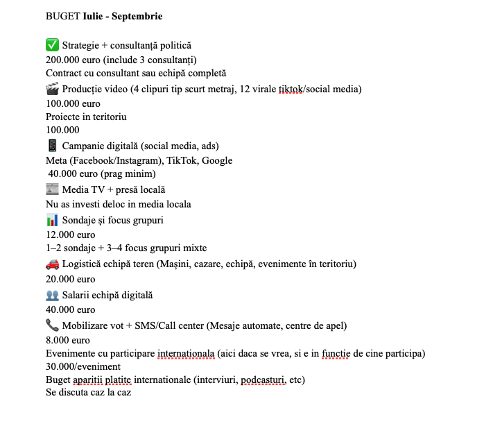 Более того, согласно документу, который представлял собой первоначальный бюджет, предложенный Викторией Фуртунэ для российских кураторов, для деятельности партии на период с июля по сентябрь требовалось 550 000 евро.