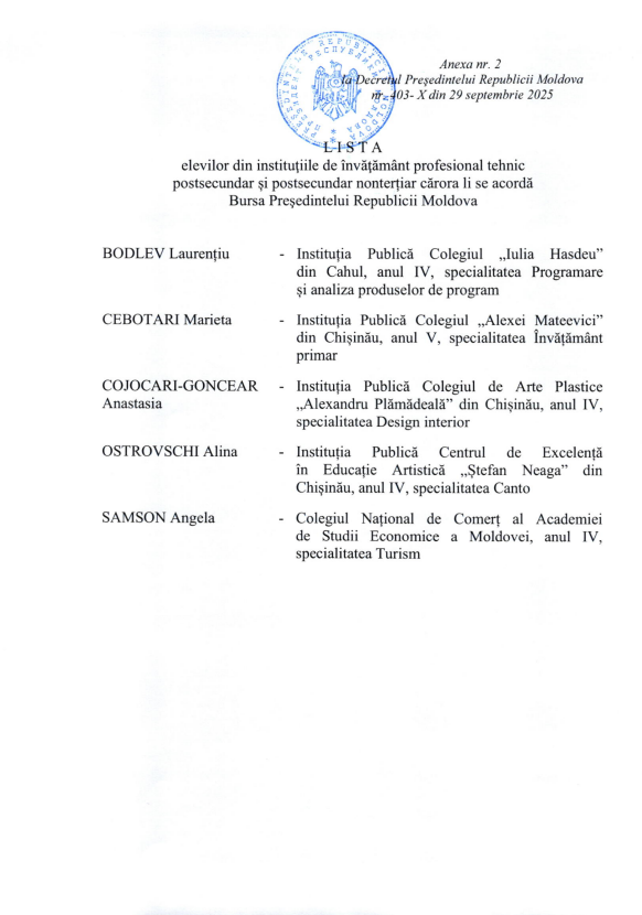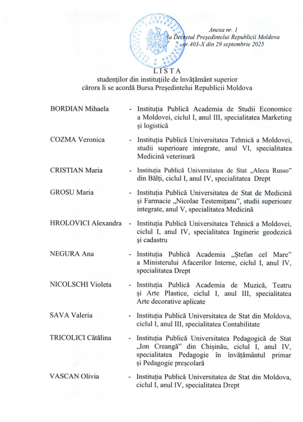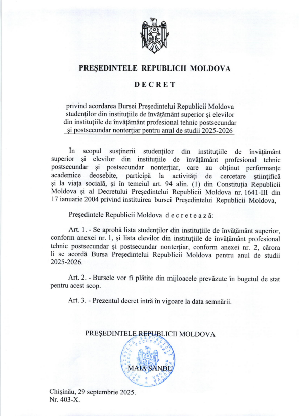 Pe 29 septembrie 2025, președinta R. Moldova, Maia Sandu, a semnat decretul prin care 15 elevi și studenți cu rezultate deosebite vor beneficia, în anul de studii 2025–2026, de Bursa Președintelui Republicii Moldova, transmite Președinția.